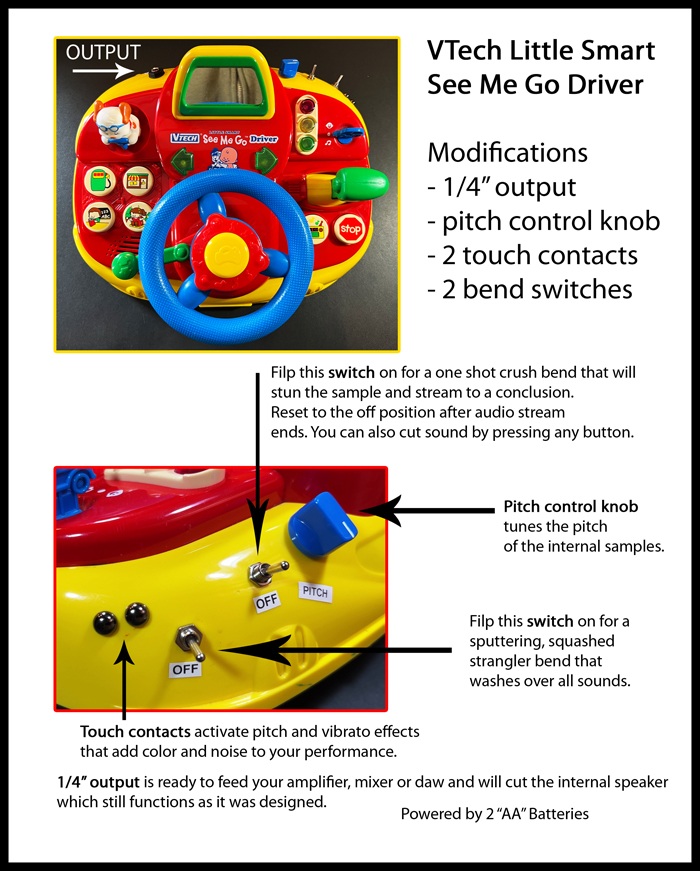 Take a drive with me and watch my circuit bent journey with a Vtech Little Smart See Me Go Driver Toy. This model has all the bells and whistles. No crash pitch mod with devastating contacts and two bend switches that ignite like sparks to sputter, squash or strangle the wide range of internal samples. Triggered by responsive buttons with colorful graphics, we have a rear view mirror and flashing lights that enhance the display. Easy to get lost at the wheel with this fun toy.